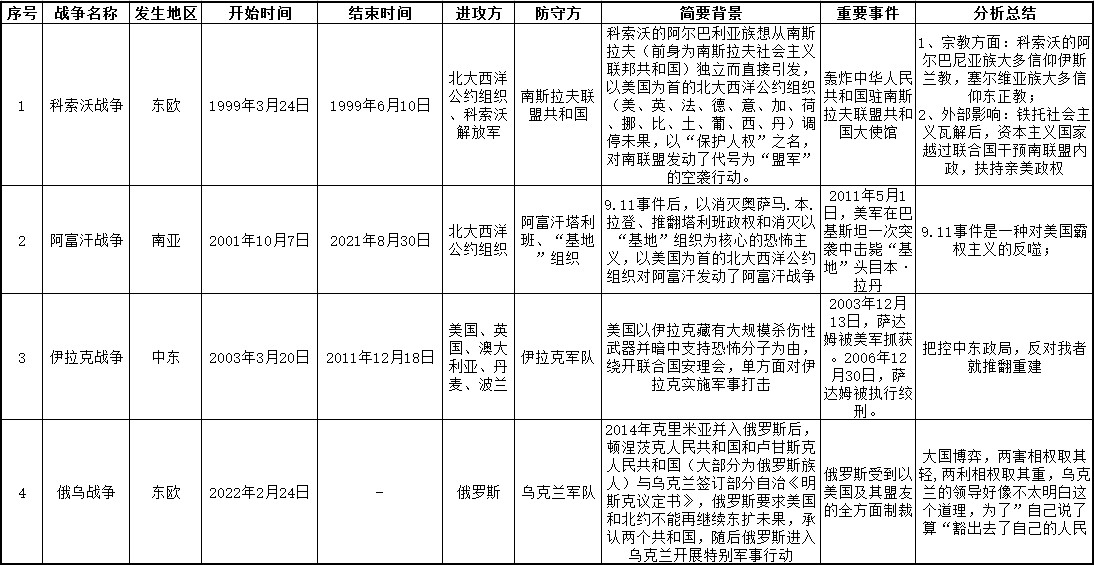 为了更加全面的认识这场战争,我统计了这些年发生的主权国之间的战争,重点包括了科索沃战争、阿富汗战争、伊拉克战争,其发生的原因很复杂,包含了宗教冲突、极端主义、霸权主义等等,但原因又很简单,这三场战争都是以美国为首的北约组织挑起,是按照他们的价值观来左右他国的政权,觉得他们主导的才是国际规则,他们信仰的才是普世价值,他们可以,异己者不行,所以西方一边倒的支持乌克兰,挑起乌克兰的民族主义,为西方的价值观摇旗呐喊。